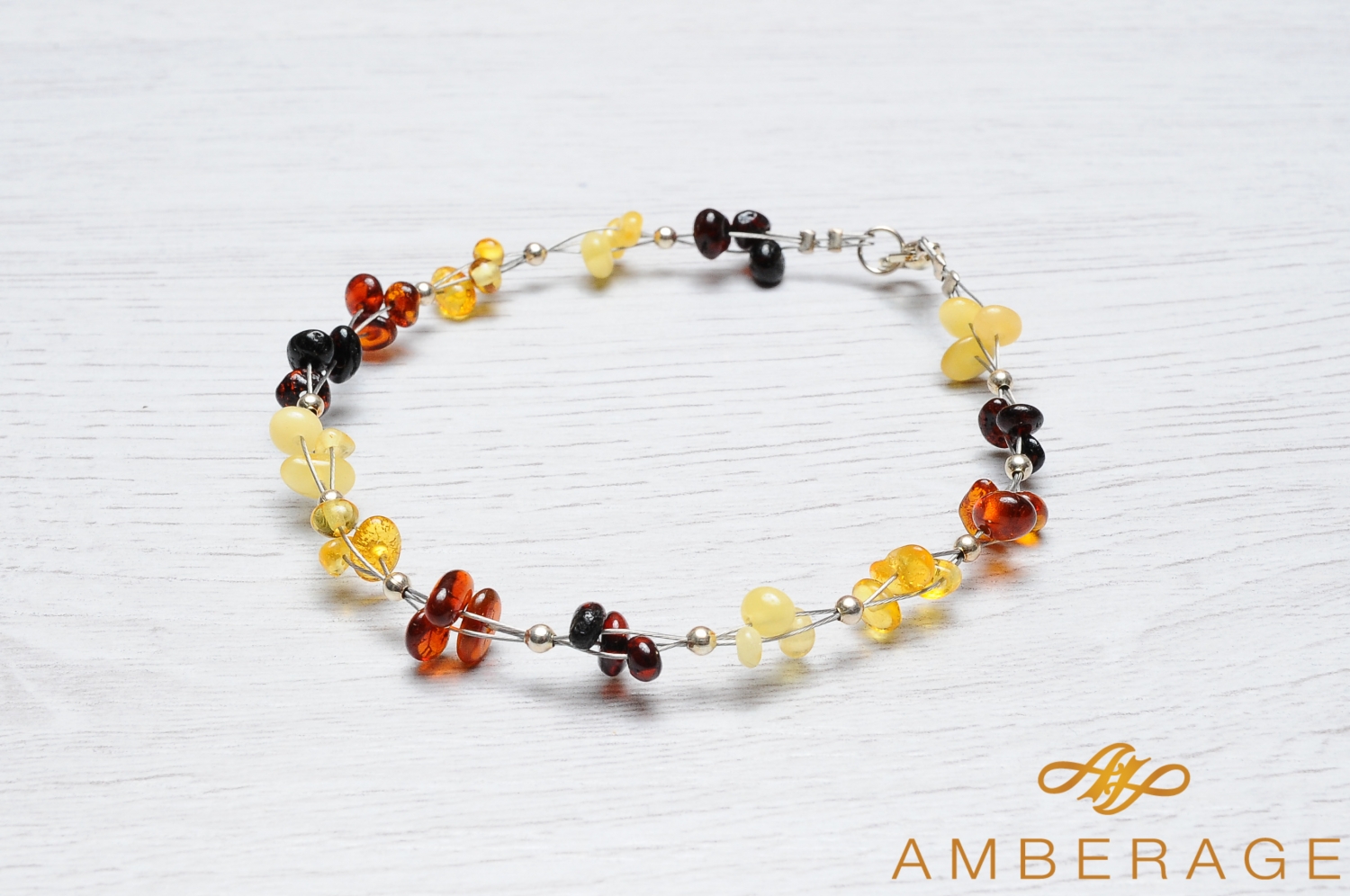 Ši apyrankė labai dekoratyvi, gintarėliai žaismingai suverti po vieną ant trijų vielučių. Tokias trijų gintarėlių grupeles vieną nuo kitos skiria mažas metalinis apvalus karoliukas, pro kurį praveriamos vielutės.